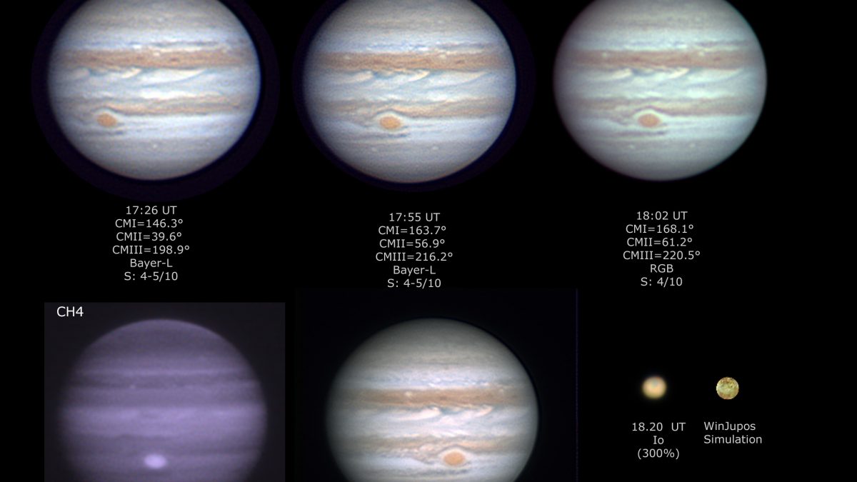 Man beachte auch die Aufnahme von Io, der Dezail zeigt, das durchaus Ähnlichkeit mit der WinJupos-Simulation der Oberfläche hat.