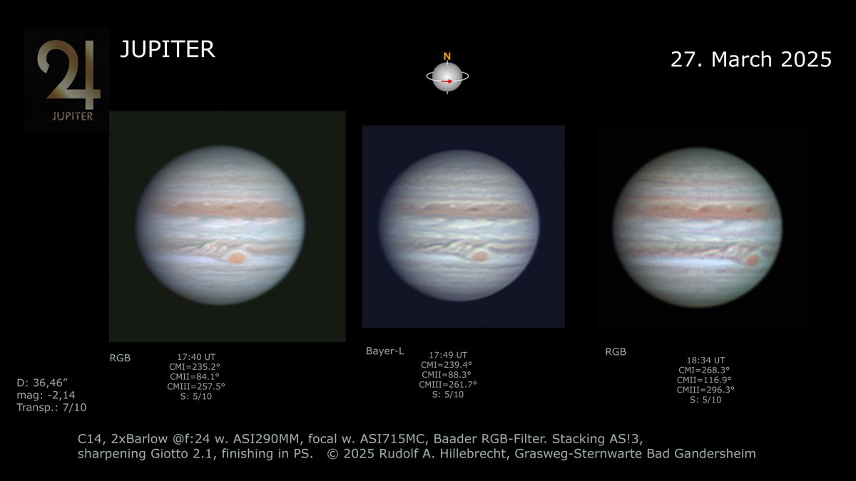 27. März 2025Drei Jupiterbilder, zweimal (links und rechts) als RGB, einmal (Mitte) als Direktfarbbild. Immer wieder interessante Entwicklungen rund um den GRF.