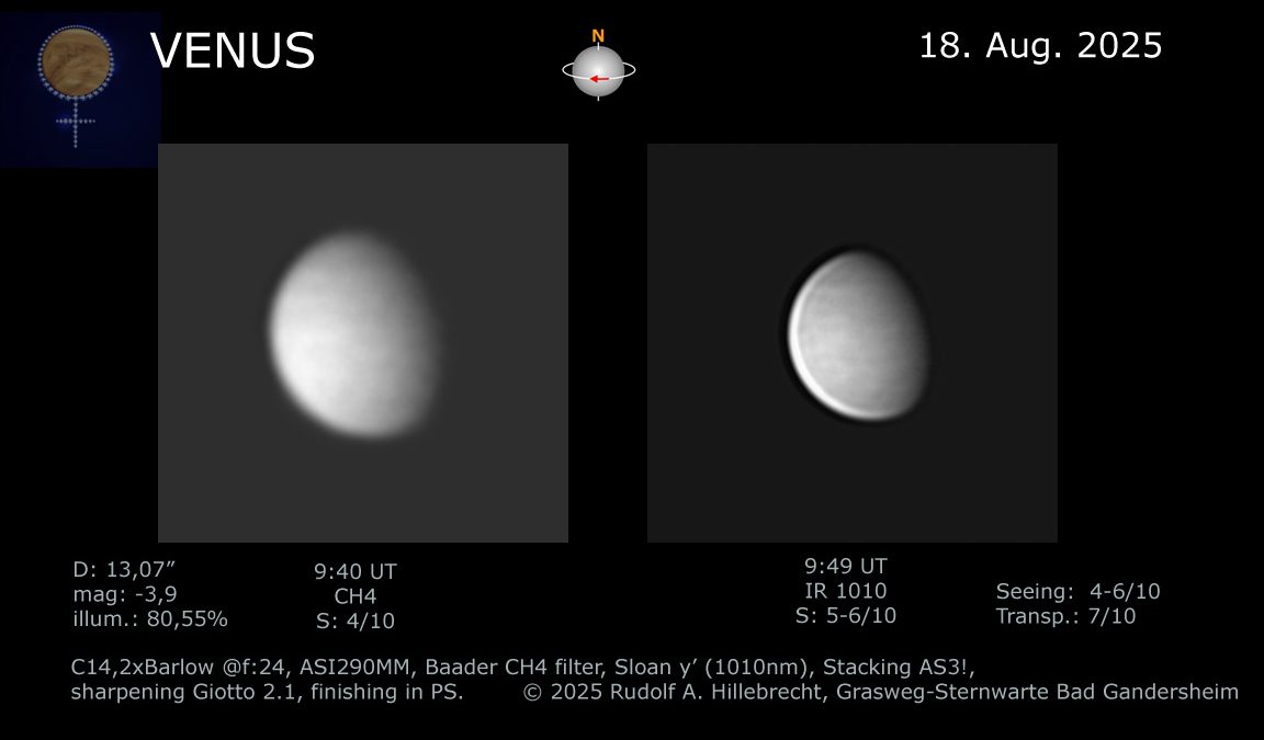 18. August 2025Venus mit Wolkenstrukturen; Seeing in CH4 schlecht in IR 1010 deutlich besser. UV ging überhaupt nicht