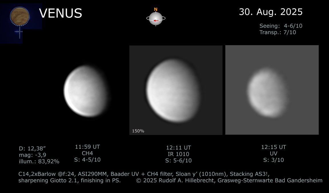 30. August 2025Recht gutes Seeing in CH4 und IR 1010, schlecht in UV. In allen drei Spektralbereichen Wolkenstrukturen.