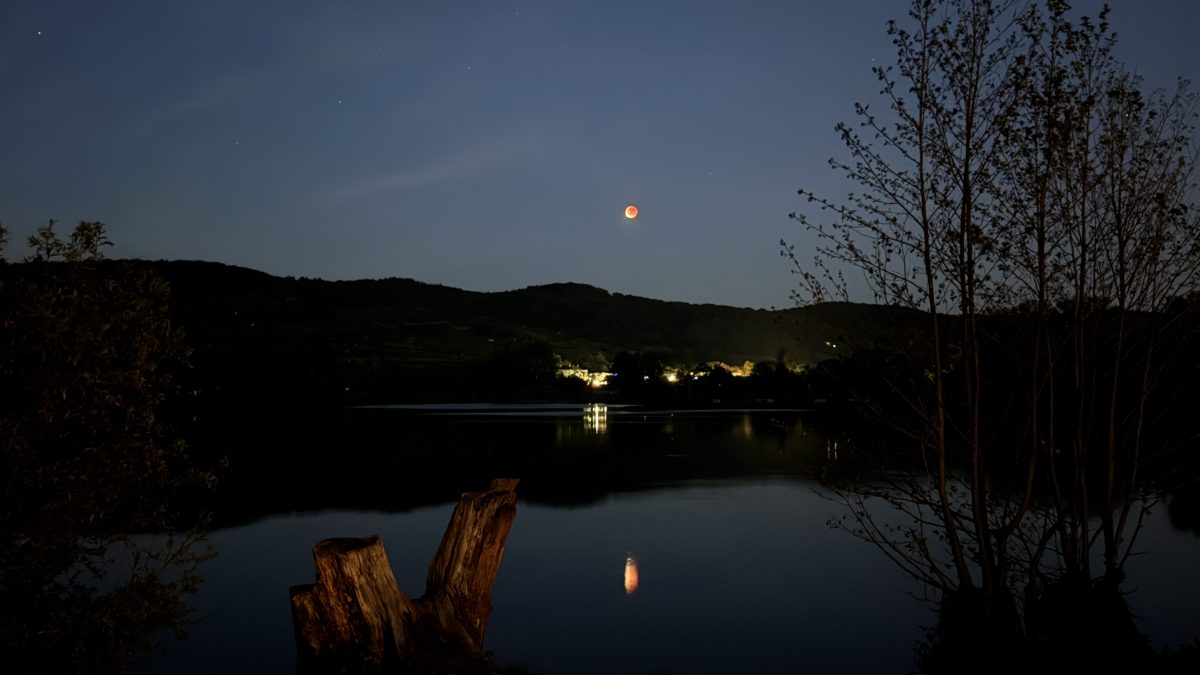 7. September 2025Handyaufnahme eine Minute nach Ende der Totalität mit Spiegelung im See.