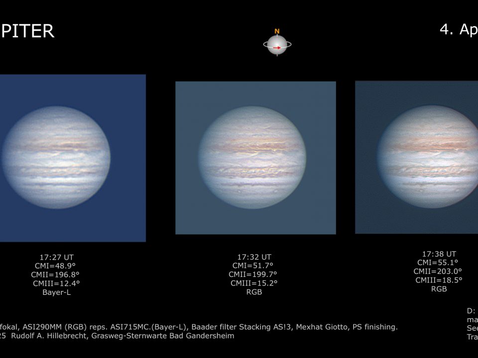 Drei Aufnahmen des Jupiter mit Farb- bzw. Monokamera. Teils sehr gutes Seeing mit enormer Auflösung. Aufnahmedatum : 4. April 2025Beobachter : Rudolf A. Hillebrecht