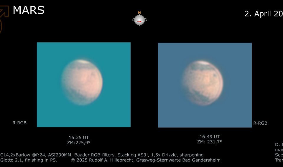 Wieder ein typischer Frühlings-Abend mit ausnehmend gutem Seeing. Hohe Auflösung für die kleine Marsgröße erreichbar. Keine Spur von Dunst oder Wolken. Aufnahmedatum : 3. April 2025Beobachter […]