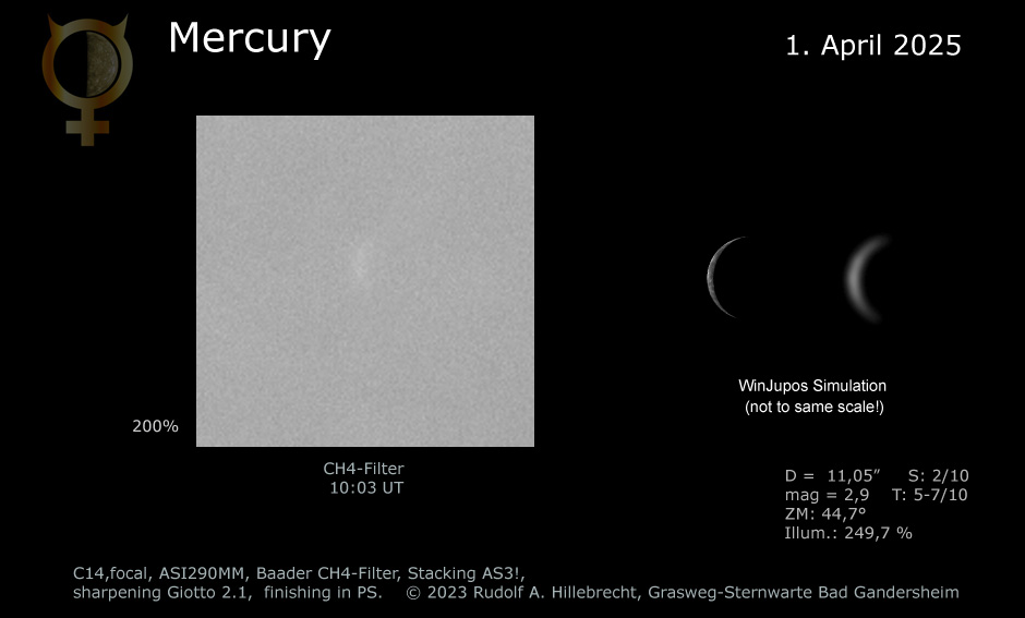 Erste gute Gelegenheit nach der unteren Konjunktion, um die noch feine Sichel Merkurs aufzunehmen. Seeing schwierig, daher keine weiteren Details auszumachen. Aufnahmedatum : 3. April 2025Beobachter […]