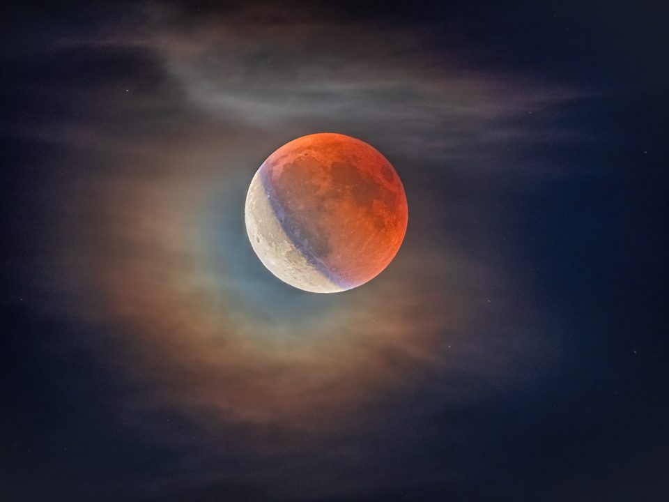 Mond mit Hof und Kränzen kurz vor Ende der partiellen Finsternisphase. Vordergrund: Bruchsee in Heppenheim. Aufnahmedatum : 07.09.2025Beobachter : Jens Rothermel