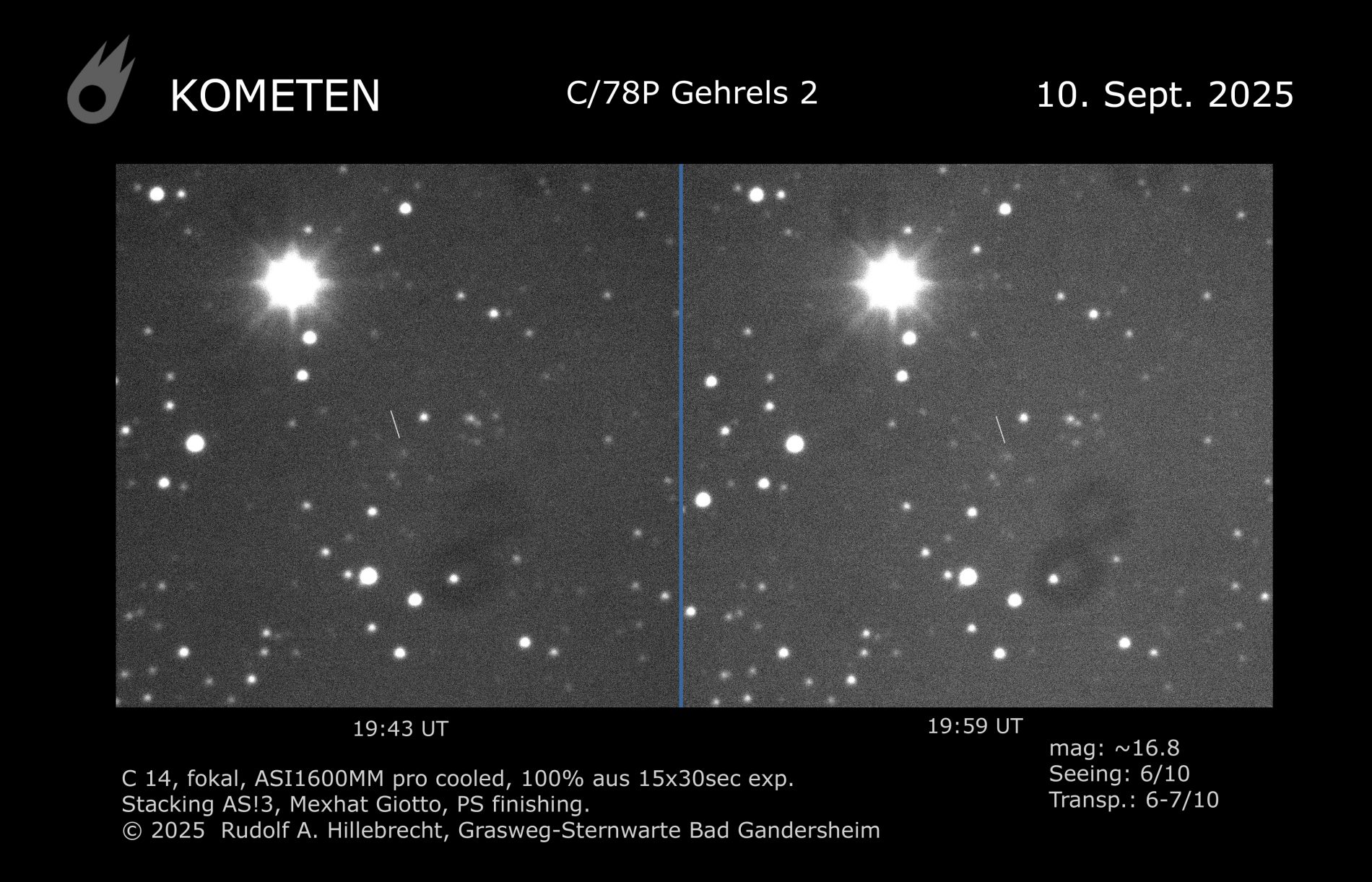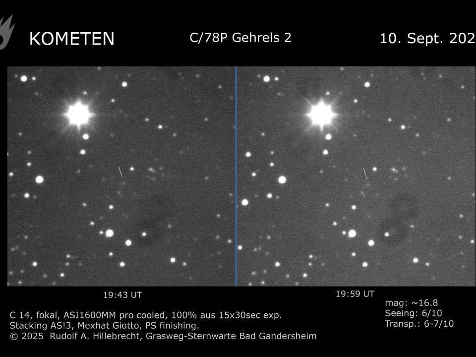 Komet Gehrels 2 (C/78P) mit C14 fokal und ASI160MM pro gekühlt in zwei 15x30sec-Belichtungen. Selbst im kurzen Zeitabstand von nur rund 16 Minuten wird seine Bewegung […]