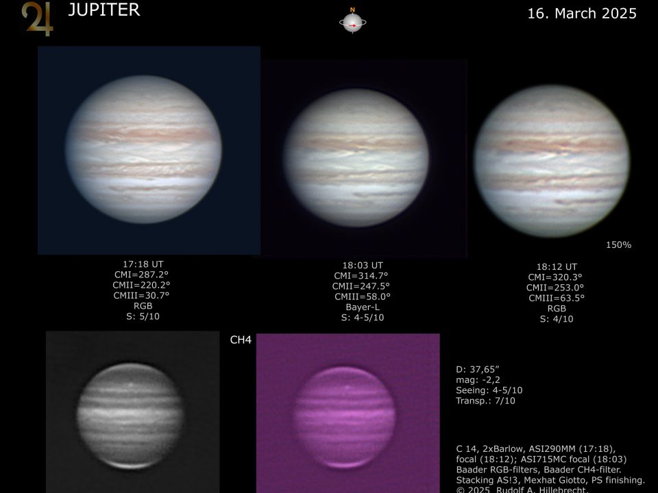 Jupiter bei durchschnittlich gutem Seeing. Bemerkenswert ist der kleine helle Fleck in der NPZ, der im Farbbild kaum auffällt, aber im Methanband deutlich heraussticht. Des weiteren […]