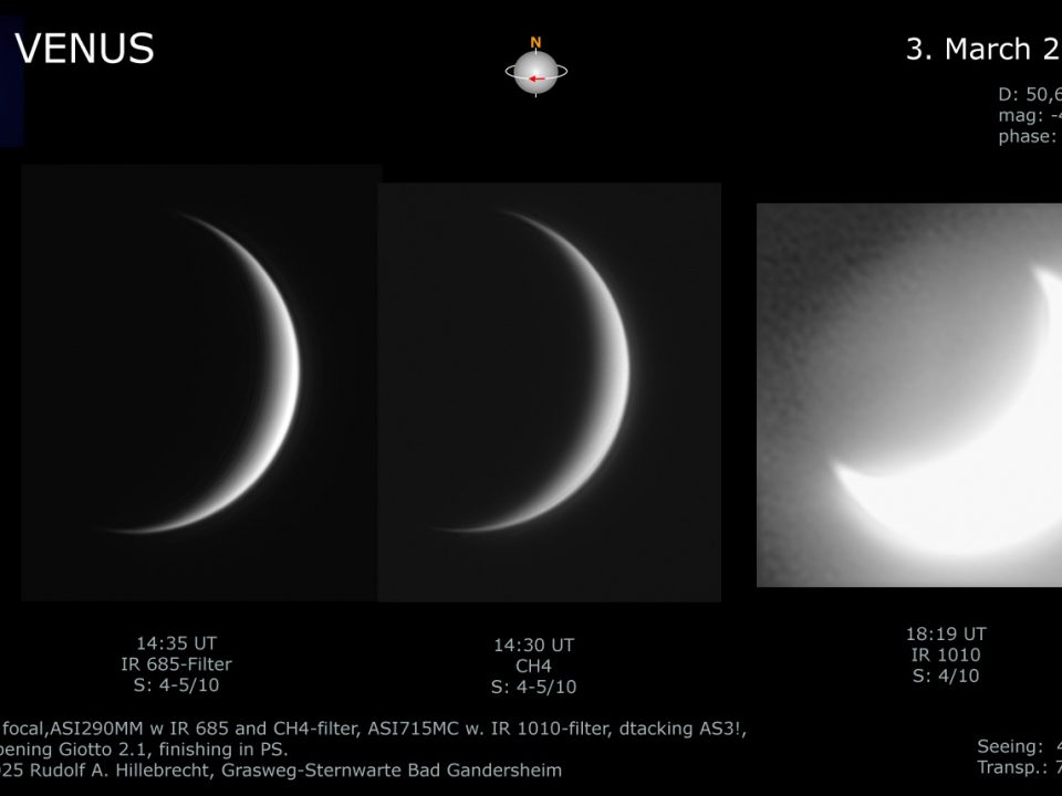 Jupiteraufnahmen bei durchschnittlichem Seeing. Bemerkenswert, dass die Methanbandaufnahme trotzdem eher überdurchschnittlich gut aufgelöst ist. Aufnahmedatum : 2. März 2025Beobachter : Rudolf A. Hillebrecht