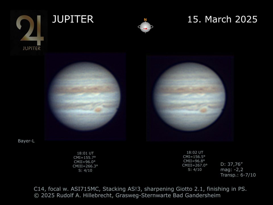 Zwei schnelle Jupiterbilder; Seeing mäßig bis schlecht. Am rechten Rand tritt Schatten der Europa aus. Aufnahmedatum : 15. März 2025Beobachter : Rudolf A. Hillebrecht