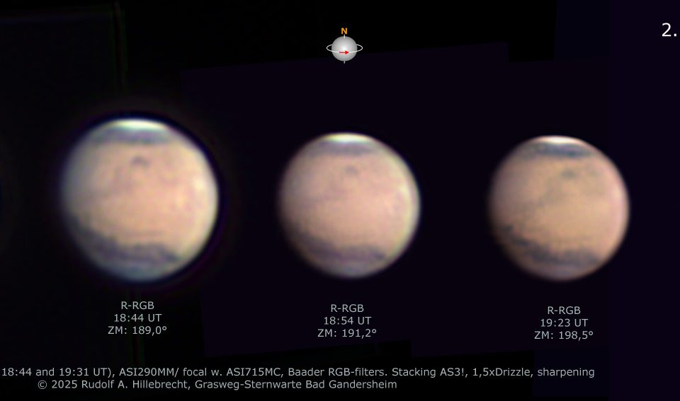 Zwei zeitnahe Marsbilder, eines bei gutem Seeing. Dunst tief im Süden und am rechten Rand Aufnahmedatum : 27. Februar 2025Beobachter : Rudolf A. Hillebrecht