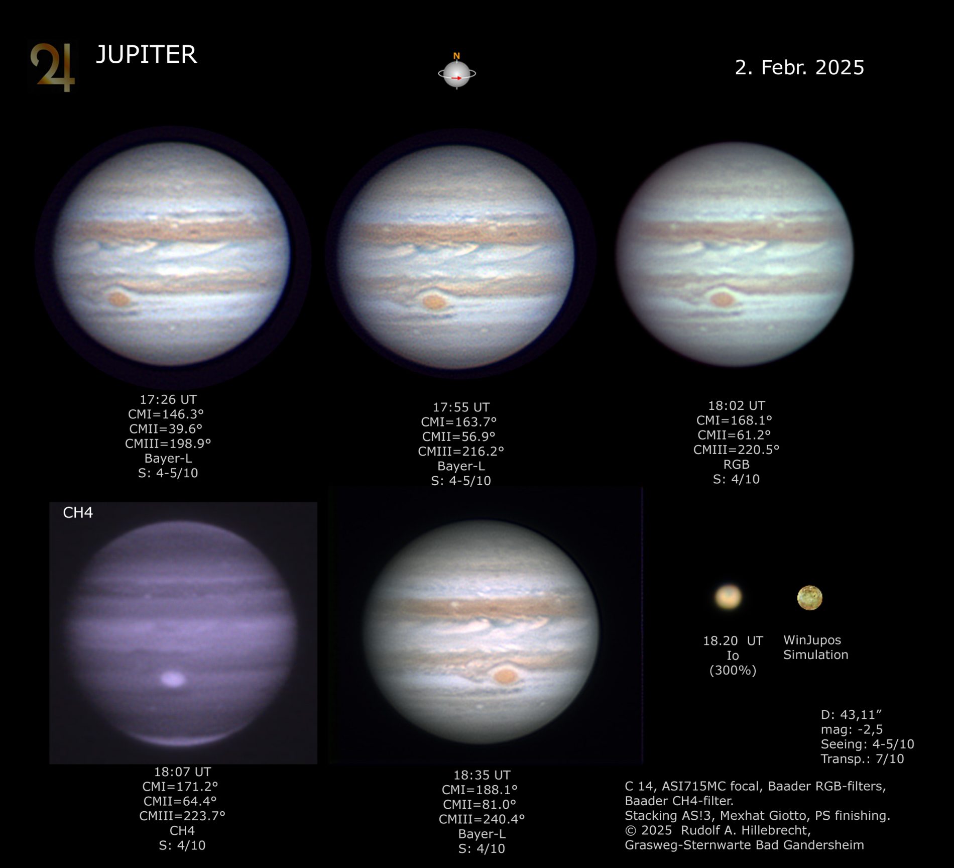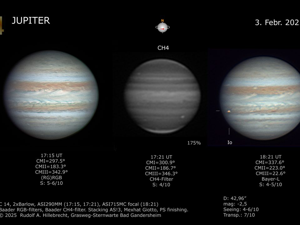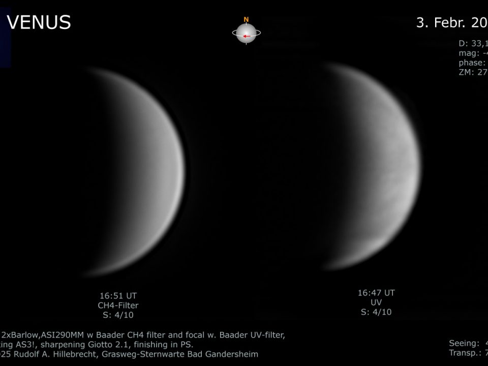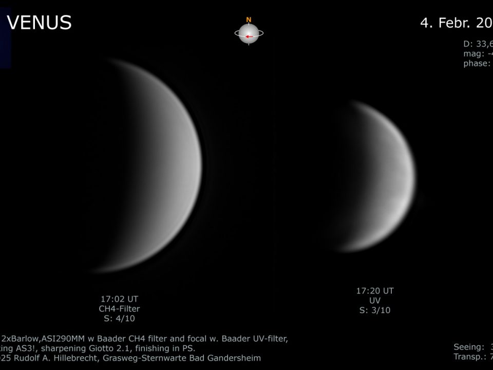 Methanband und UV-Aufnahmen der Venus; im UV sind einige Wolkenstrukturen auszumachen. Aufnahmedatum : 4. Februar 2025Beobachter : Rudolf A. Hillebrecht