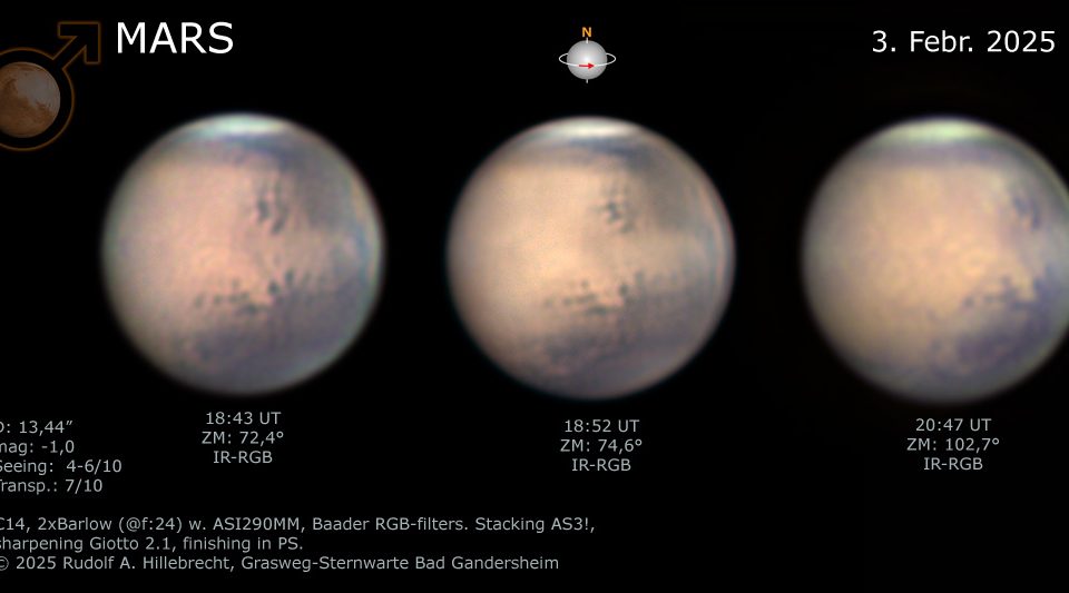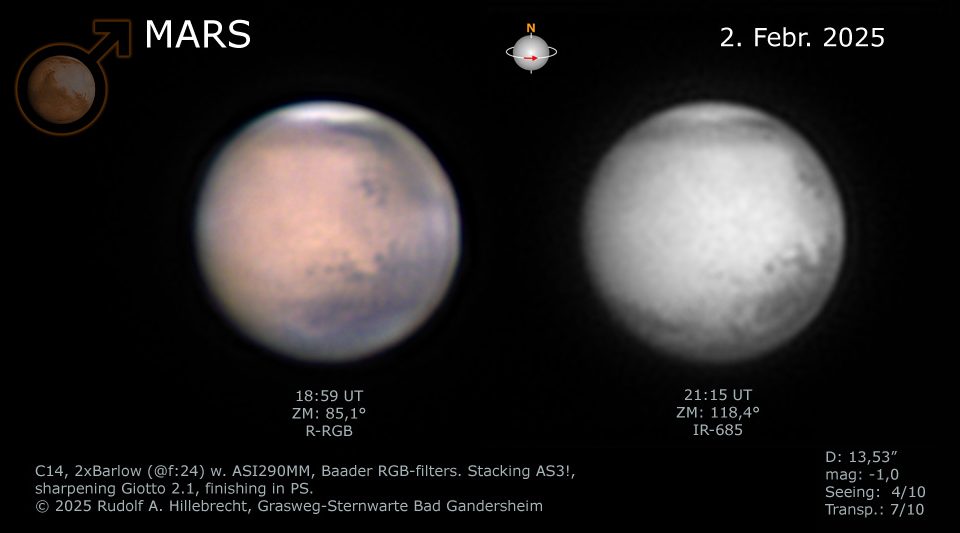 Seeing heute nicht besonders gut. Ein RGB-Bild, danach nur noch ein IR-Bild sinnvoll machbar. Aufnahmedatum : 2. Februar 2025Beobachter : Rudolf A. Hillebrecht