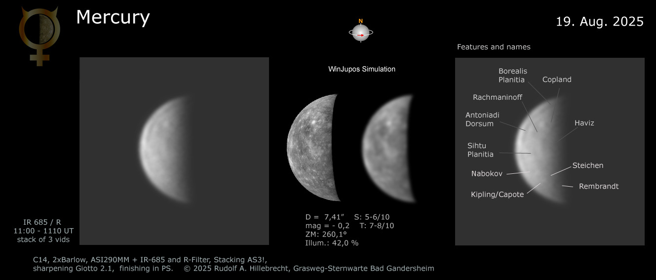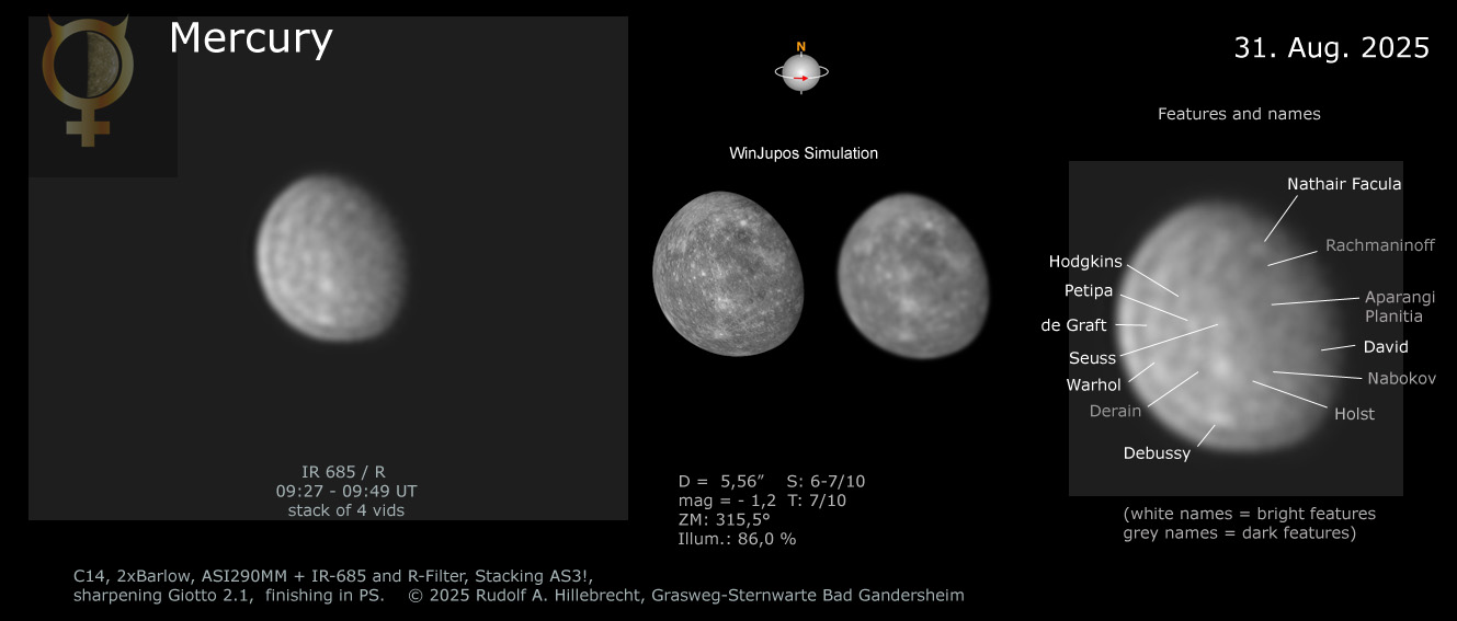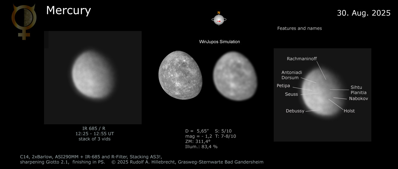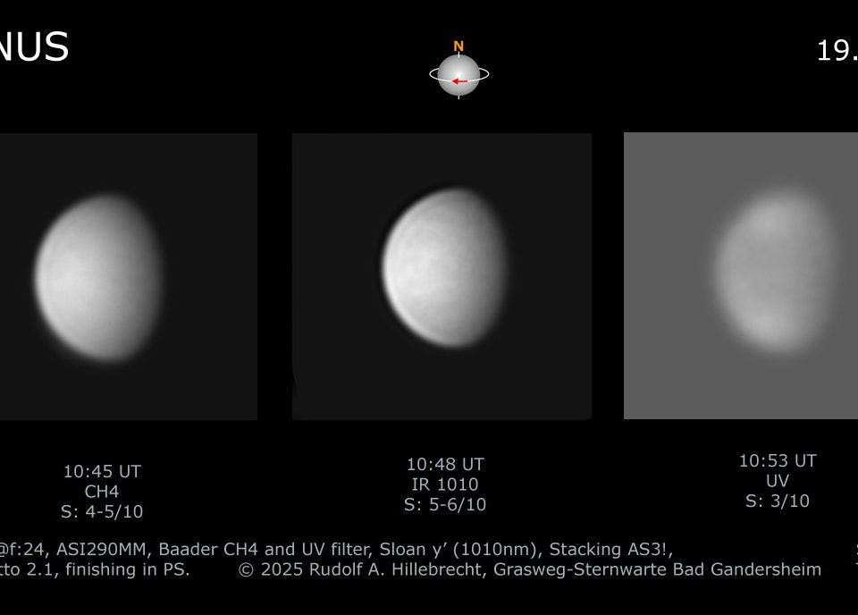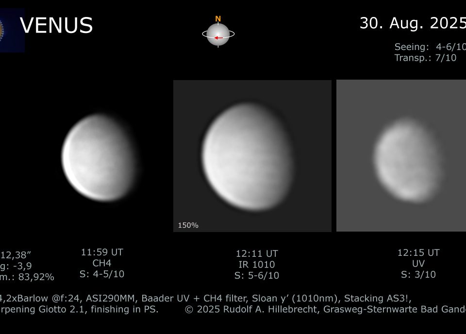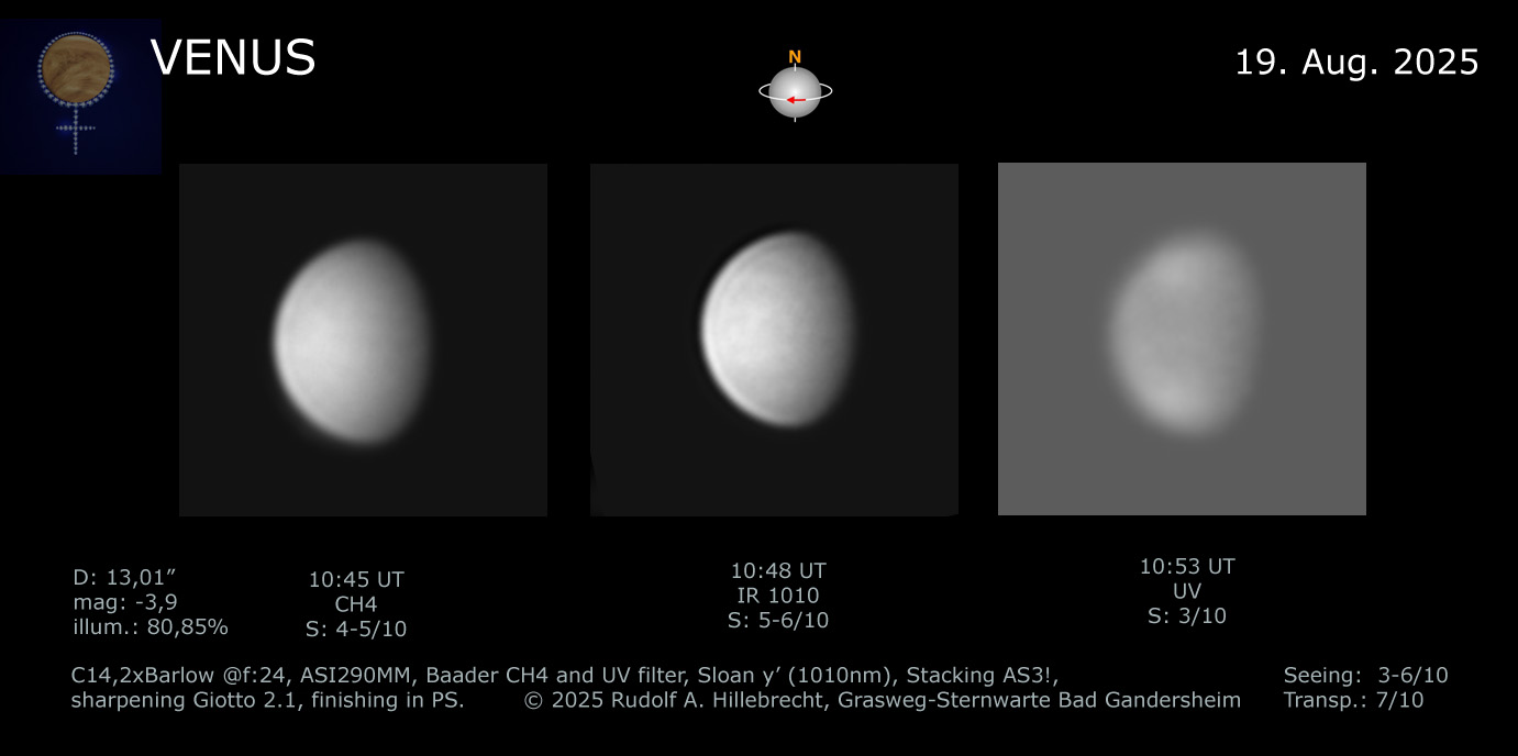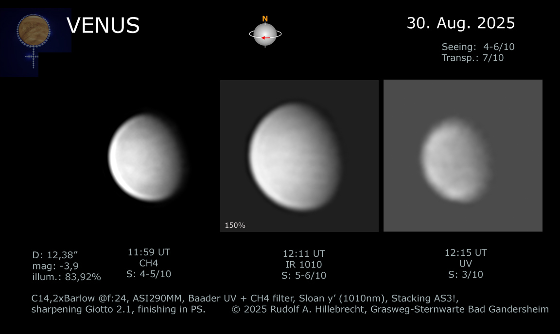 Recht gutes Seeing in CH4 und IR 1010, schlecht in UV. In allen drei Spektralbereichen Wolkenstrukturen. Aufnahmedatum : 30. August 2025Beobachter : Rudolf A. Hillebrecht
