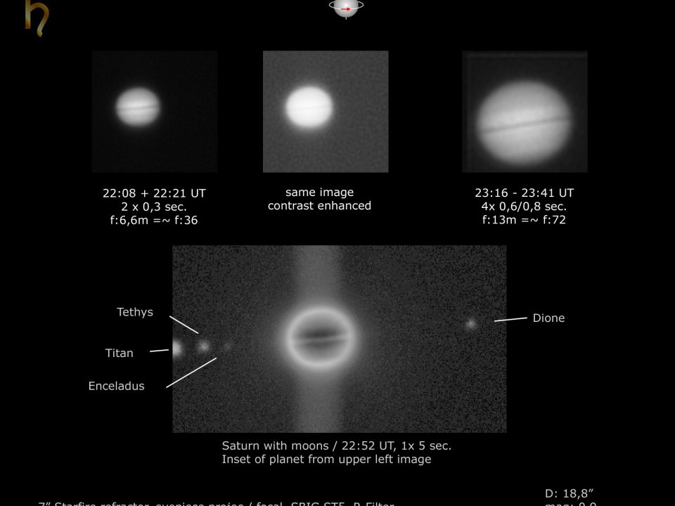 Aufnahmen des absolut ringlosen Saturn (Polneigung 0,1 Grad) mit 7″ Starfire Refraktor und SBIG ST 5 CCD-Kamera. Weitere Daten im Bild. Aufnahmedatum : 5. August 1995Beobachter […]