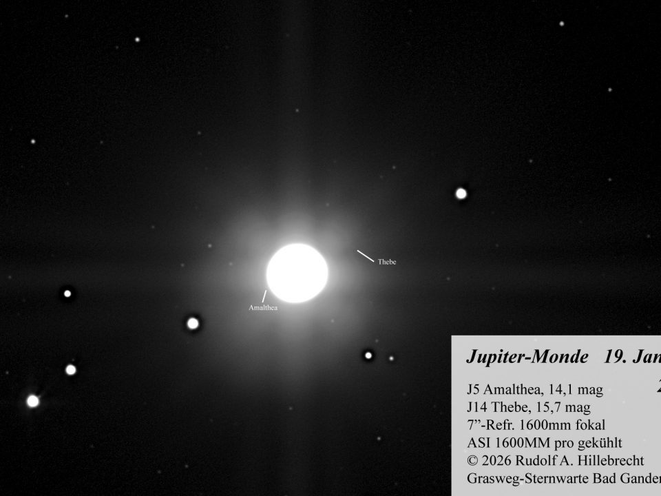 Jupiter äußere Monde, 19. Januar 2026, hier J5 Amalthea (14,1 mag) und J14 Thebe (15,7 mag) Starfire-Refraktor 7″, 1600mm fokal, ASI1600MM pro gekühlt weitere Daten im […]