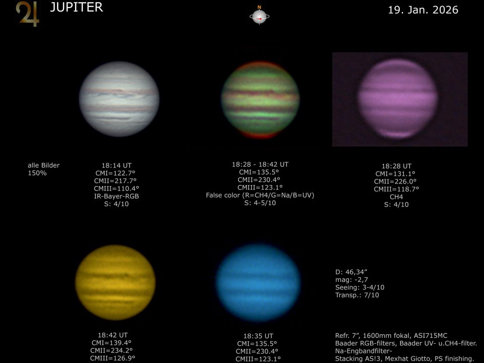 Jupiter 19. Januar 2026, aus Gründen schlechten Seeings nicht am C14, sondern dem 7″ Starfire Refraktor aufgenommen. (IR)-Bayer RGB und Farbfilter CH4, UV, Na. weitere Daten […]