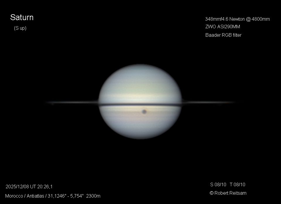 Derotiertes Bild des Saturn mit Titan vor der Scheibe. Derotation über 38 Minuten Aufnahmeintervall. Weitere Daten im Bild! Aufnahmedatum : 22.11.2025Beobachter : Torsten Hansen